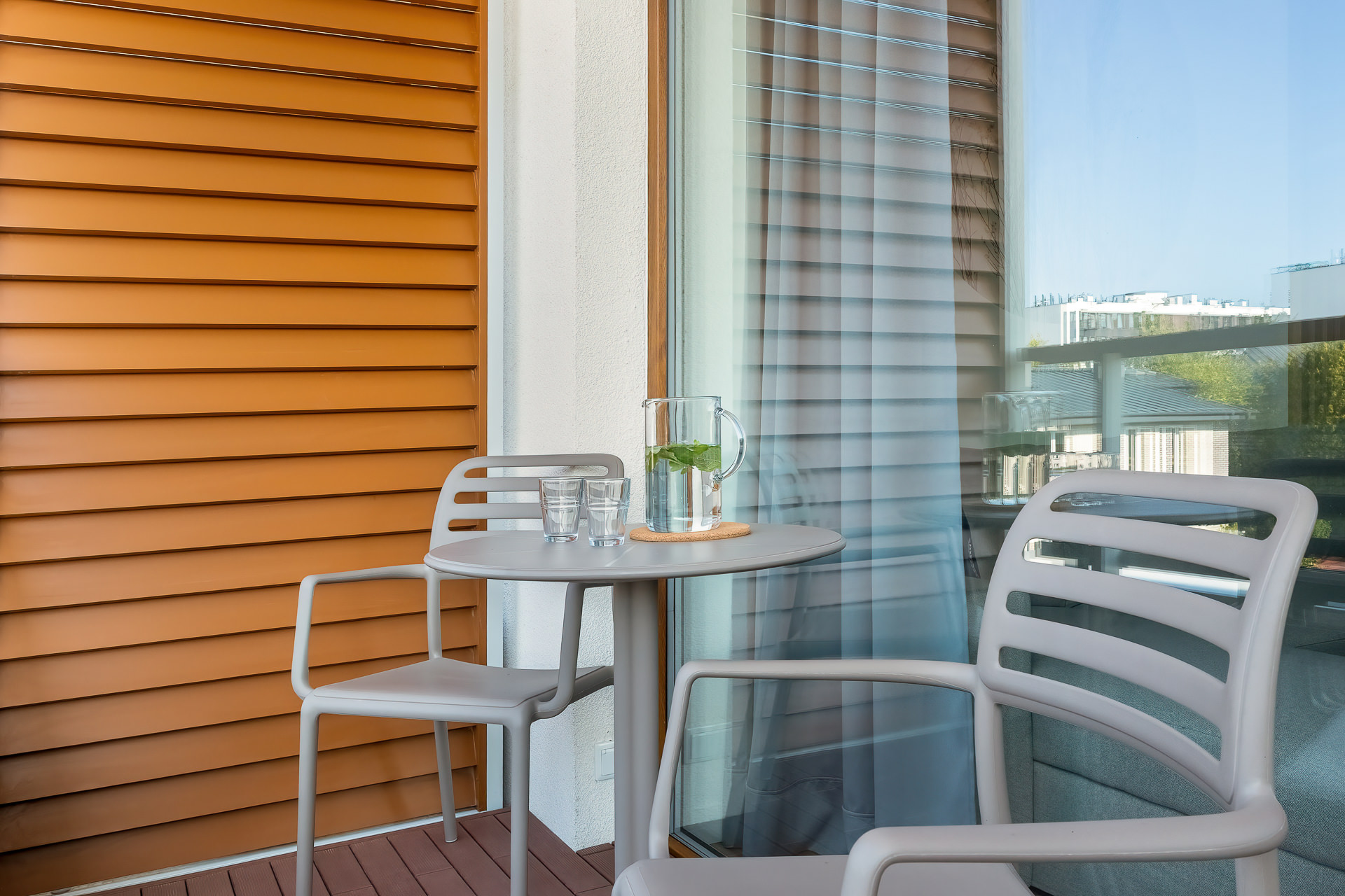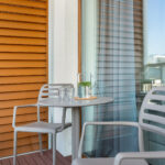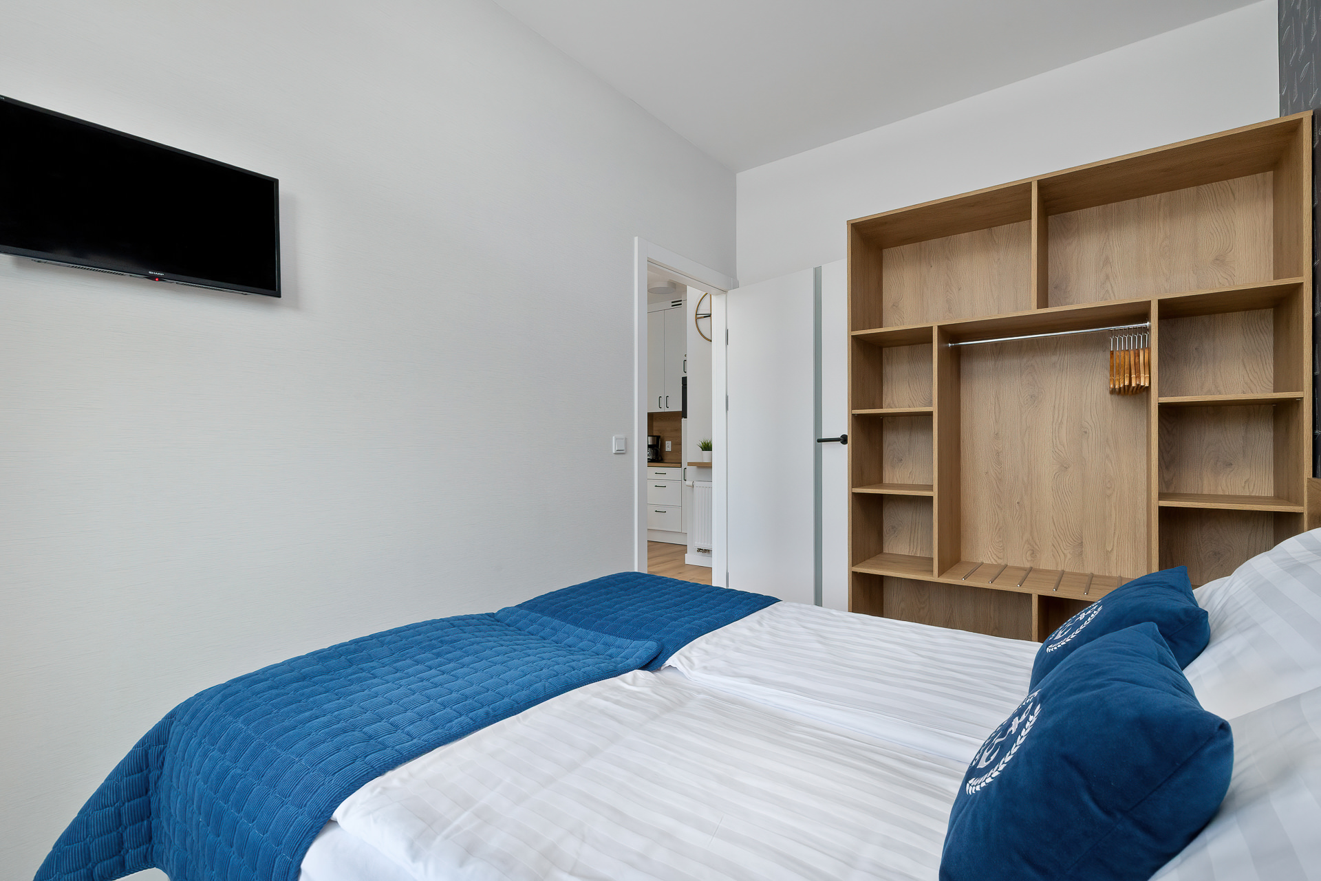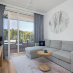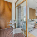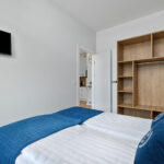 Apartament to 36m2 na które składa się salon z aneksem kuchennym, sypialnią oraz łazienką. W salonie rozkładana dwuosobowa sofa. W sypialni duże łóżko z możliwością rozdzielenia na dwa pojedyncze. Do apartamentu przynależy balkon na całą szerokość lokalu, a na dachu znajduje się prywatny 40 metrowy taras z widokiem na morze i zachody słońca.